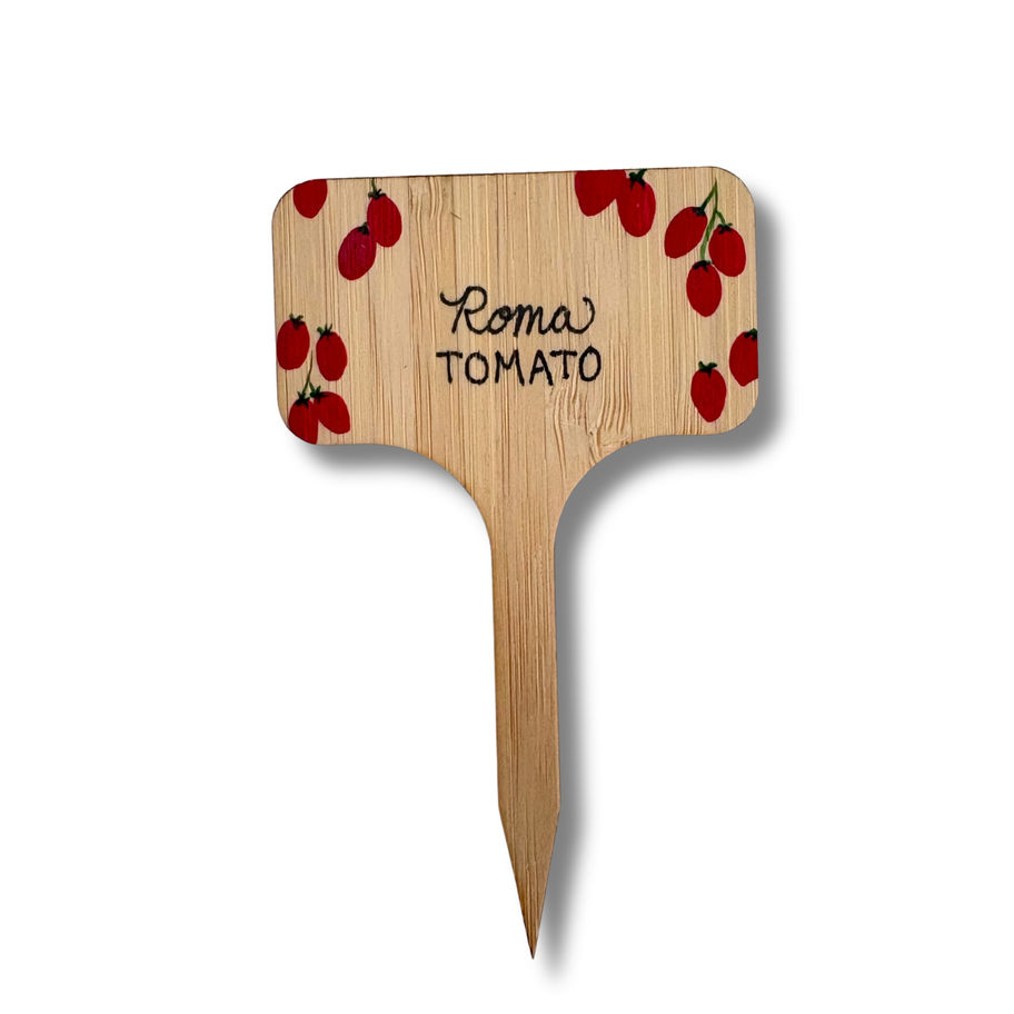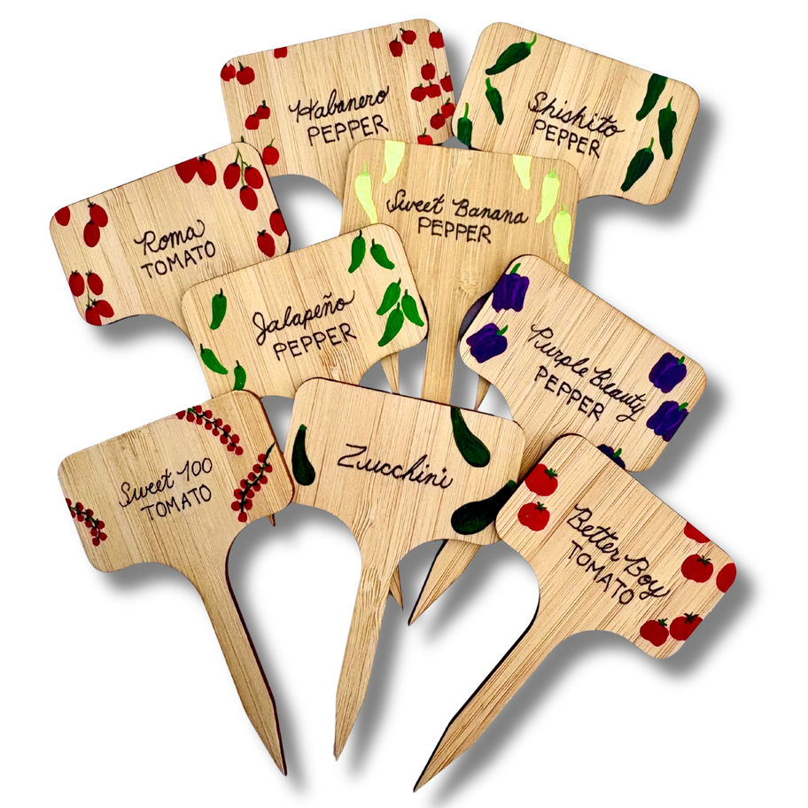 Each one is painted by hand, individually illustrated with the plant it represents — plump tomatoes, vibrant jalapeños, delicate shishitos. Pressed into the soil of a raised bed or tucked into a planter on the porch, they turn something purely functional into something intentional and beautiful. Made from natural bamboo with a sturdy stake base. Built to live in the garden all season long.
